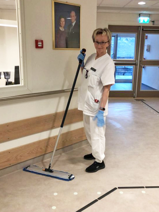 Renholder Sissel Hårstadstrand gjør sammen med resten av renholdspersonalet en god innsats for å forebygge smitte.