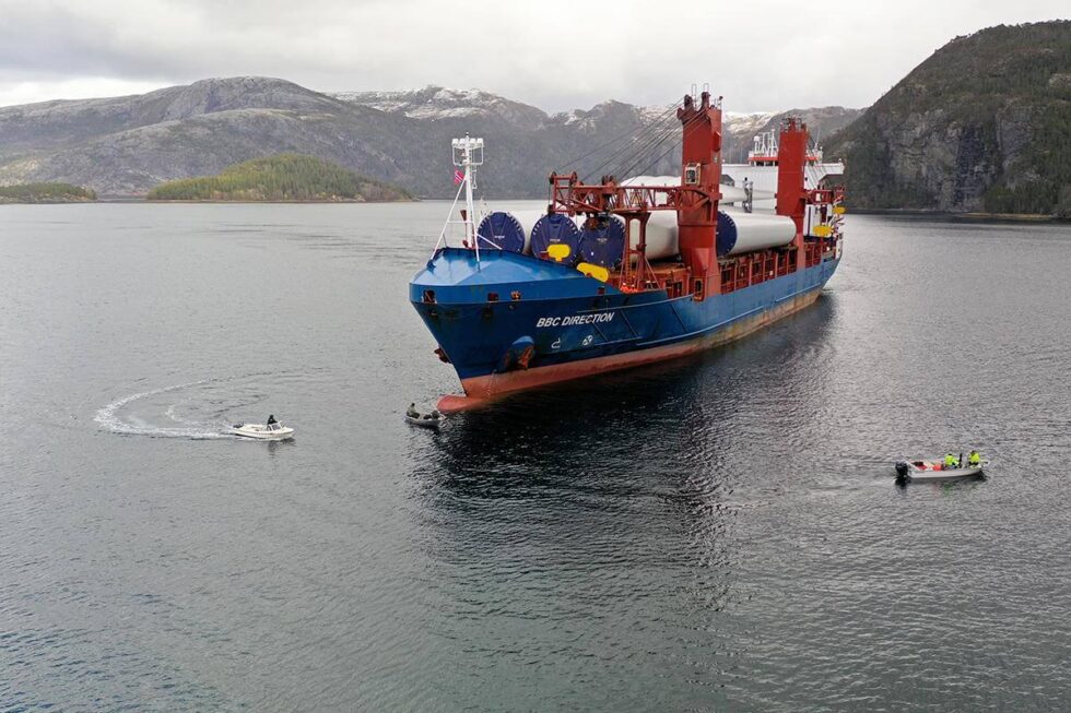 Frakteskipet «BBC Direction» skal frakte alle delene til de 31 vindturbinene på Sørmarkfjellet. Søndag kom den første av 8 båtlaster. Mandag starter arbeidet med å transportere delene fra kaia i Hestdalsvika og opp på fjellet.