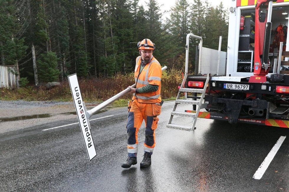 Denne uka startet Odd Arne Renå og Rune Møllslet i Peab Anlegg med å sette opp de siste skiltene.