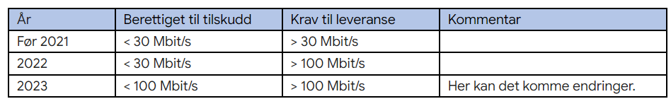 For offentlige tilskudd gitt i til og med 2022, har kravet for å få tilskudd vært at det ikke eksiterer et tilbud på 30 Mbit/s eller mer. Fra og med 2023 forventer vi at dette kravet økes til 100 Mbit/s. Løsningen man skal tilby med offentlig tilskudd har til og med 2021 vært 30 Mbit/s eller mer, fra og med 2022 er dette økt til 100 Mbit/s.
