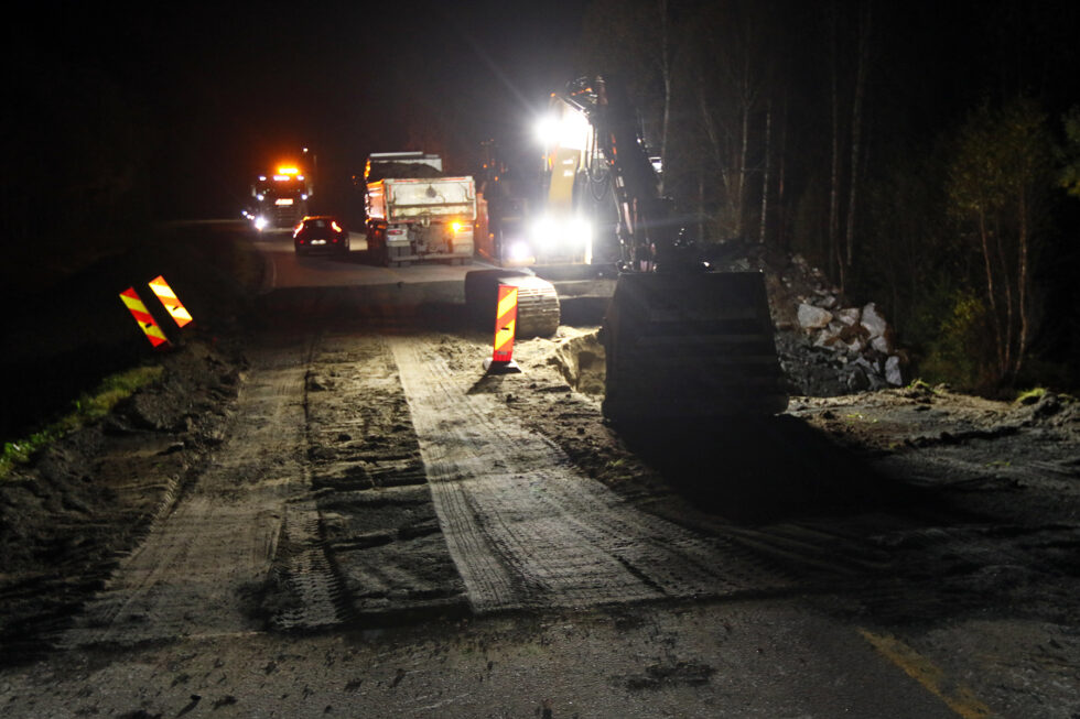 Da Flatangernytt og andre som hadde vært i Namsos på forestilling passerte i 23.30-tida, var halve veibanen gravd over, men det var mulig å passere.