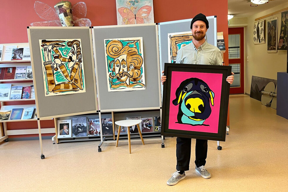 På ettermiddagstid stilte Kveen ut kunstverkene sine på biblioteket i en utstilling ved navn «Strek i regningen».