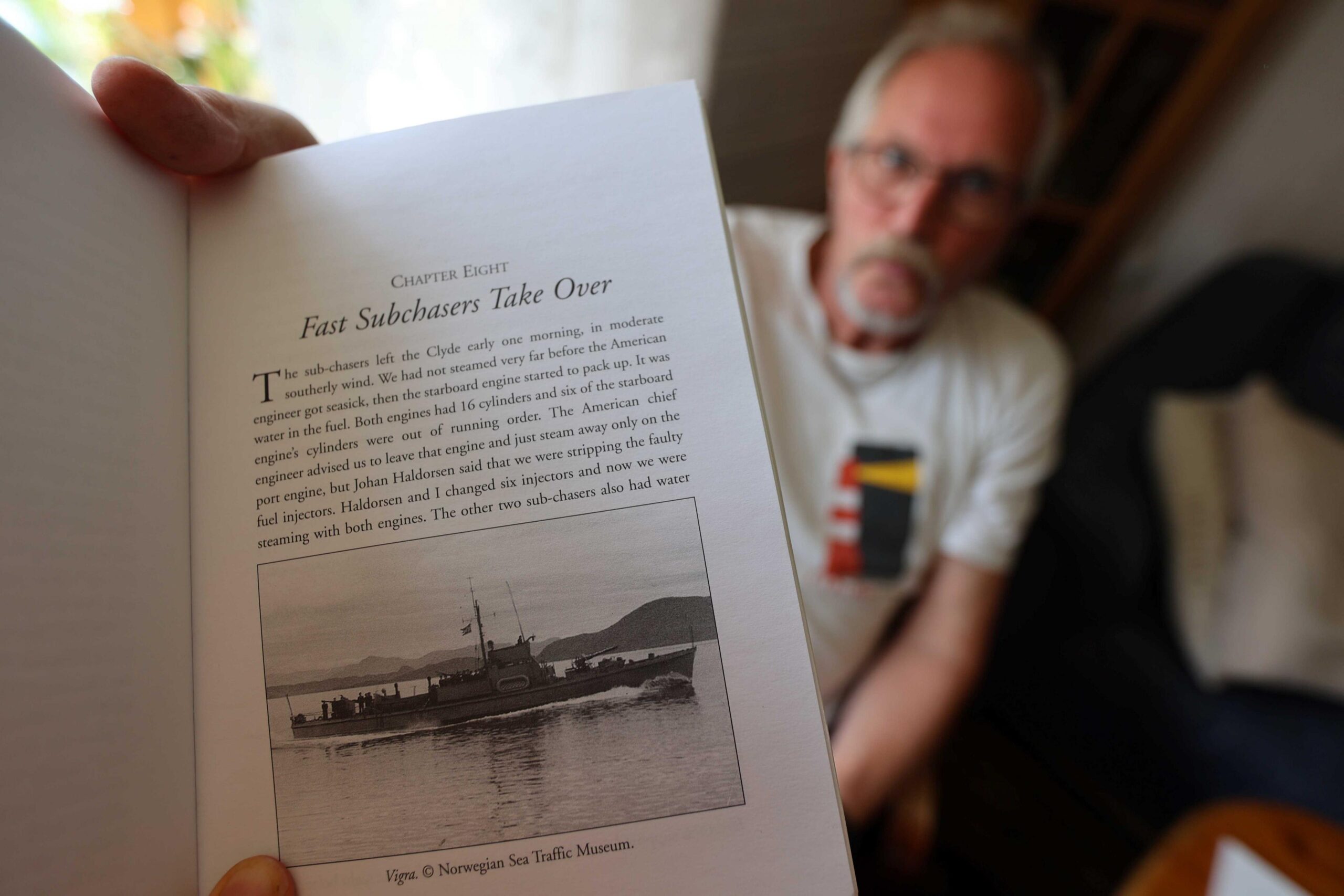 Reidar Lindseth blar igjennom den engelske versjonen av Shetland Bus Man, utgitt i 2004. I løpet av høsten håper Historielaget å få gitt ut den norske oversettelsen som de allerede er i gang med å redigere. Lindseth er valgt som redaktør for prosjektet.