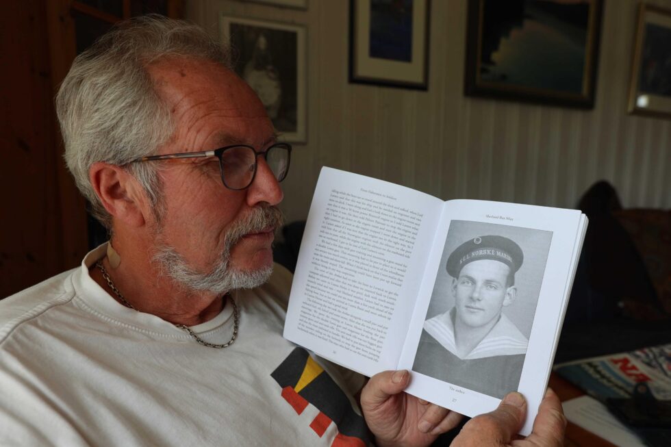 Reidar Lindseth blar igjennom den engelske versjonen av Shetland Bus Man, utgitt i 2004. I løpet av høsten håper Historielaget å få gitt ut den norske oversettelsen som de allerede er i gang med å redigere. Lindseth er valgt som redaktør for prosjektet.