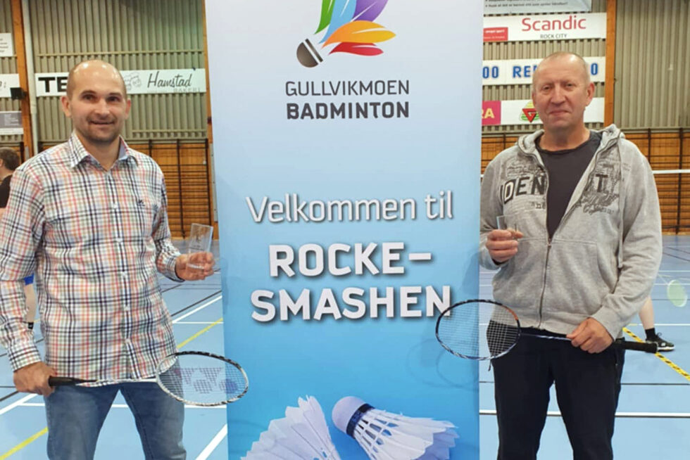 Badminton-spillerne Raimonds Silins (48) og Kastytis Bartusevicius (56) fra Flatanger hentet heim pokaler fra helgas badminton-turnering i Grong.