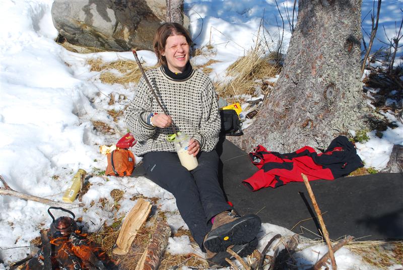 Bålet fyres opp, og vi setter oss rundt det på hvert vårt reinskinn. Stille blafring og knitring fra bålet høres, og tre par øyne stirrer fredfullt inn i de gulrøde flammene. Både skuldrene og roen senker seg, og ingen av oss vil være noe annet sted enn akkurat her.