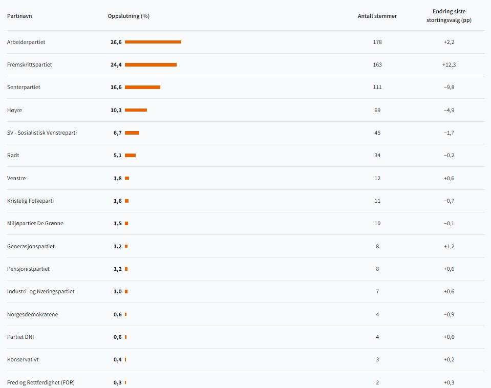 Ap får litt lavere oppslutning etter den siste opptellinga, og ender på 26,6 prosent. Det er 1,1 prosent lavere enn først meldt, men uansett 2,2 prosent høyere enn for fire år siden.