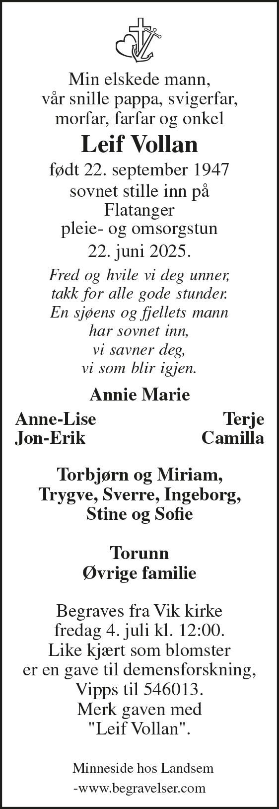 Leif Vollan Ove Magne RibsskogAnsvarlig redaktørPublisert: 23. juni 2025 kl. 20:25Oppdatert: 19. februar 2026 kl. 10:40 Del på Facebook Del på X Se annonsen her med lenke til minneside, minnegave og blomster. Du vil kanskje også lese Trønderbonden sikrer Norges matfat og inspirerer til et tryggere Norge Bigbang til sommerens Tangspræll på Lauvsnes Barn og ungdom må prioriteres høyere i 2026 Skidag med påskestemning på Oppland
