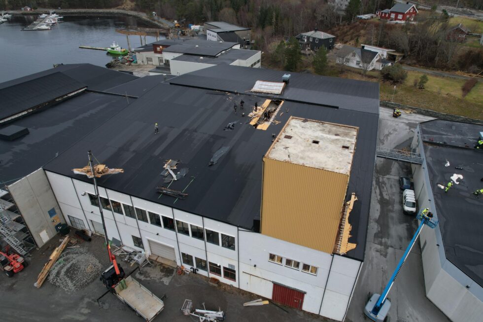Det ble en god del materielle saker på taket over settefiskanlegget, og det kom inn noe vatn gjennom taket i natt. Men ansatte fikk åpnet undertaket og begrenset skadene.